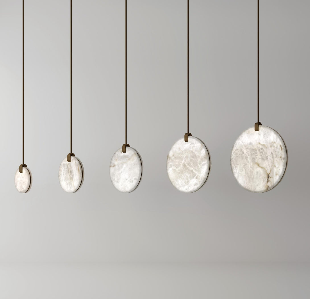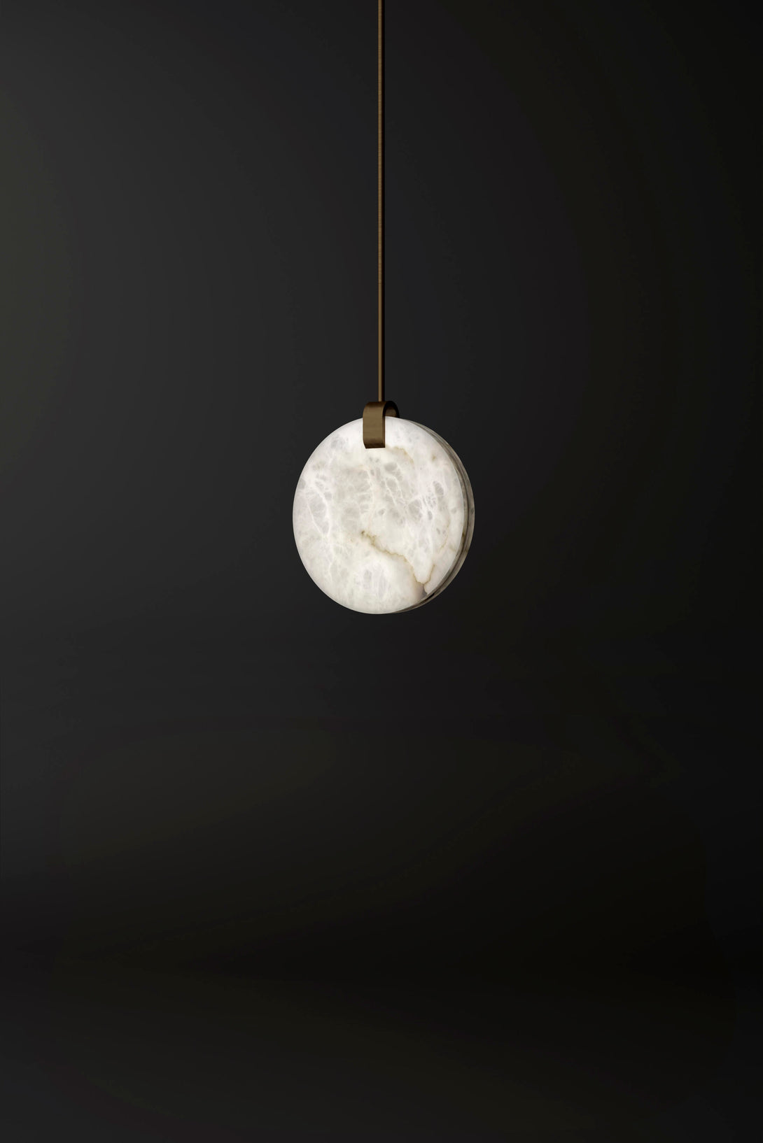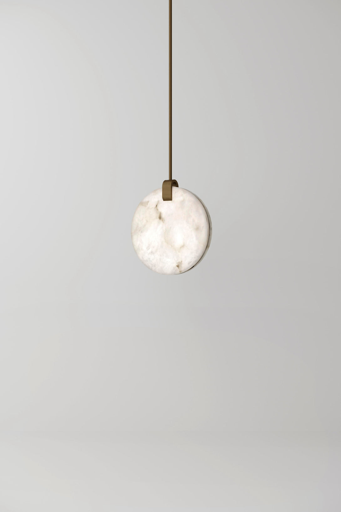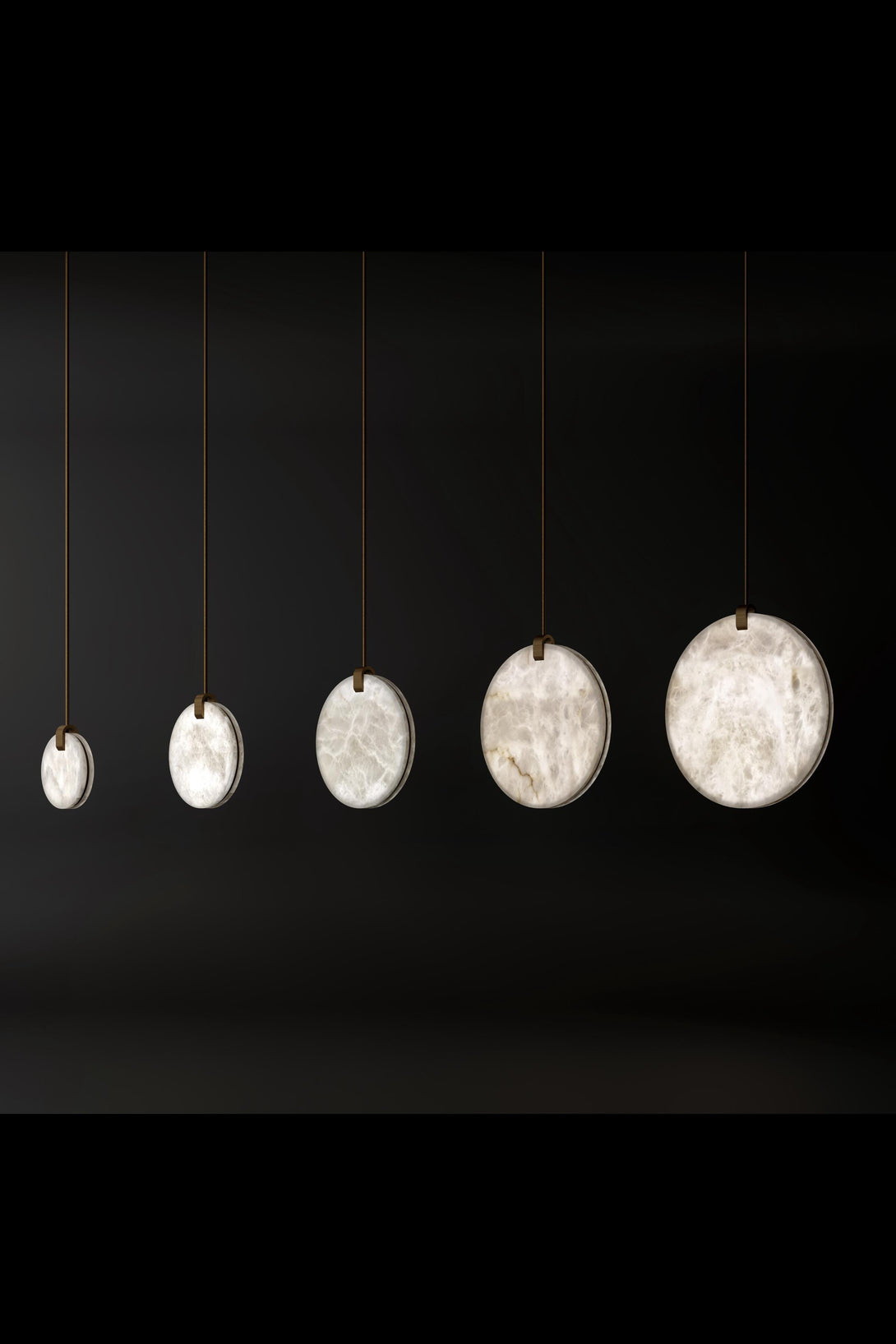 Like a pendulum, the Soho Pendant consists of two discs made of alabaster rounds joined by a smaller metal ring interior. The result is a hanging light that glimmers with a gentle glow while appearing airy and weightless. Offered in a range of disc sizes, the pendant can be tailored to fit any environment.