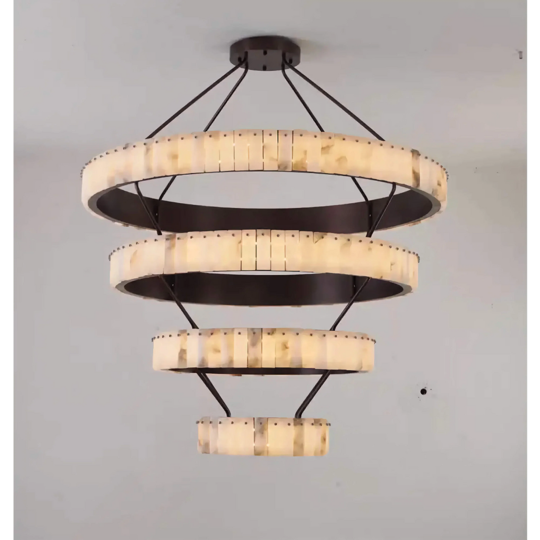 Integrated warm LEDs provide both uplight and downlight, creating a soft, inviting glow ideal for staircases, galleries, and atrium-scale interiors. The hand-carved alabaster tiles diffuse light beautifully, offering an ethereal ambiance that elevates any luxury residential or hospitality setting. This chandelier is more than a light fixture—it is an architectural centerpiece that embodies timeless elegance and enduring craftsmanship.