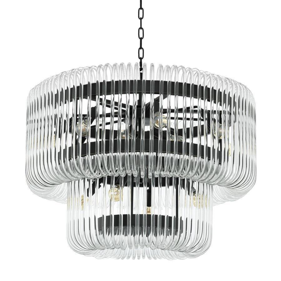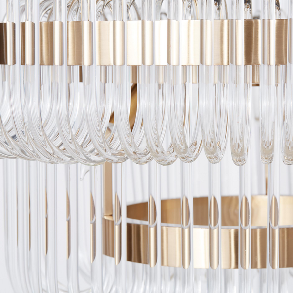With its pronounced 1920s appeal, the enthralling Art Deco inspired Sutton House Chandelier enlivens each interior space. Featuring two rounded tiers with sparkling glass rods, this lovely luminaire has a bronze fixture for an elegant contrast.