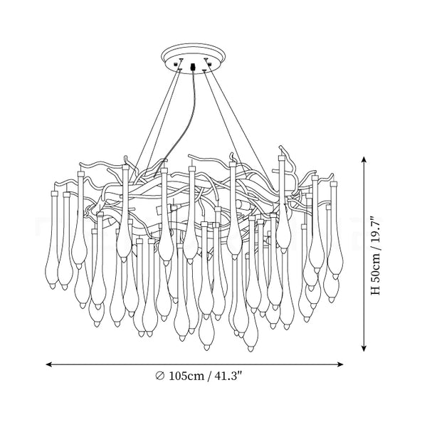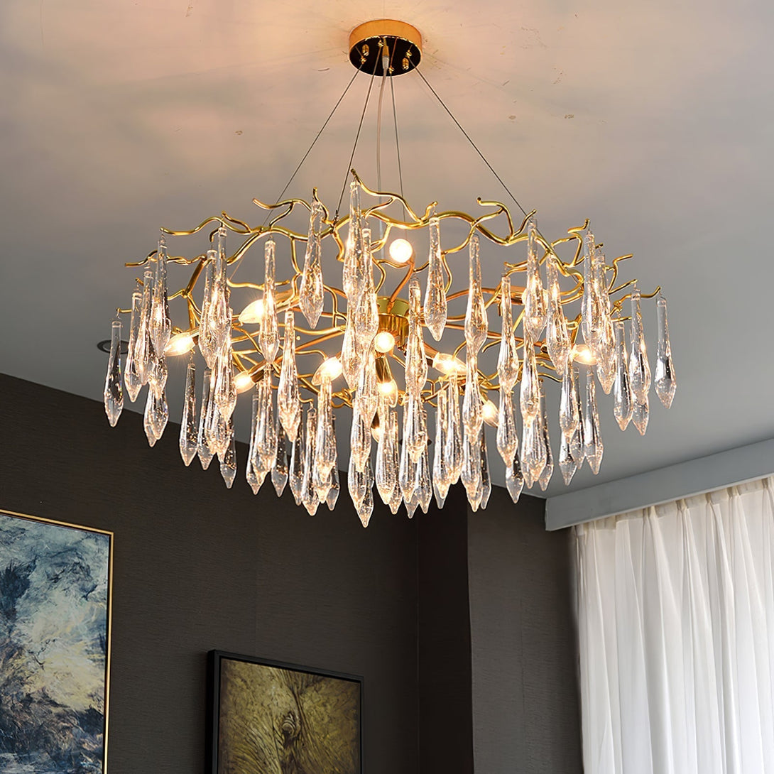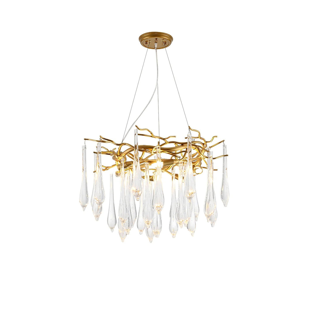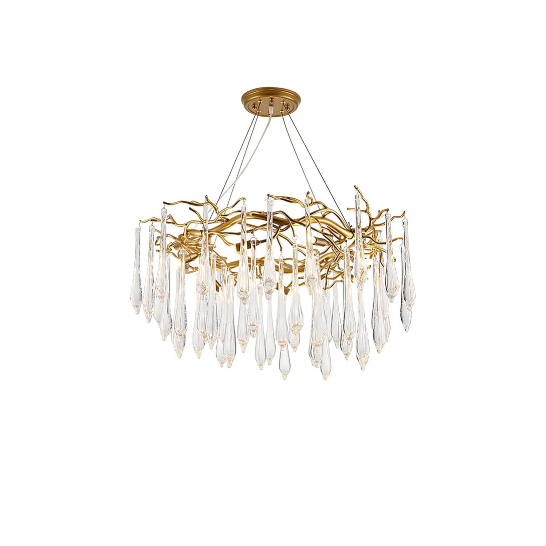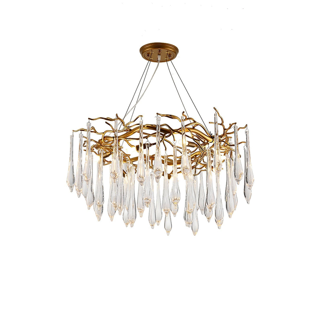 A mesmerizing statement that will inspire awe from above, the fitting features organically formed brass branches dripping with teardrop shapes of handblown glass. Crafted so that it plays with light in an enchanting manner, the chandelier would command attention in a contemporary space.