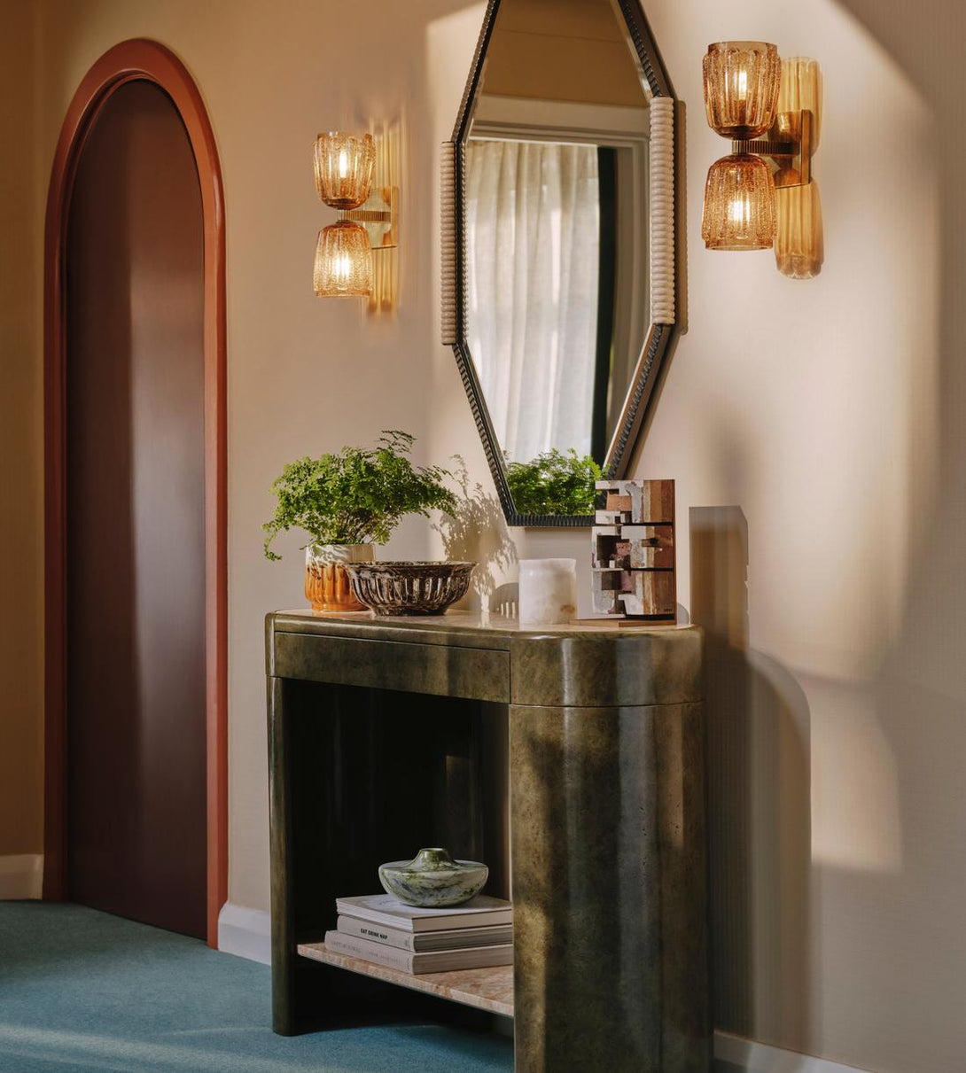 Fitted with both up and down-turned glass shades to evenly distribute the light, our Thea lamp is secured by a brass frame that fits flush to the wall.
