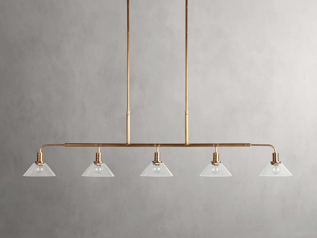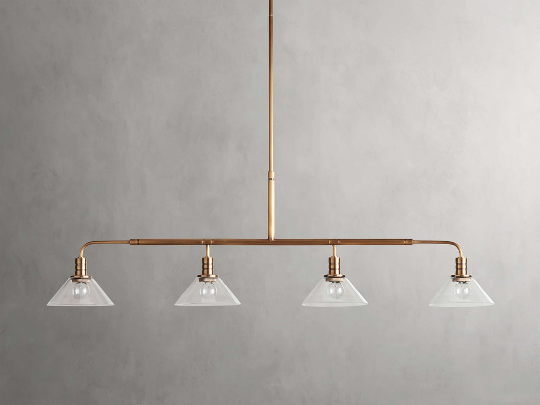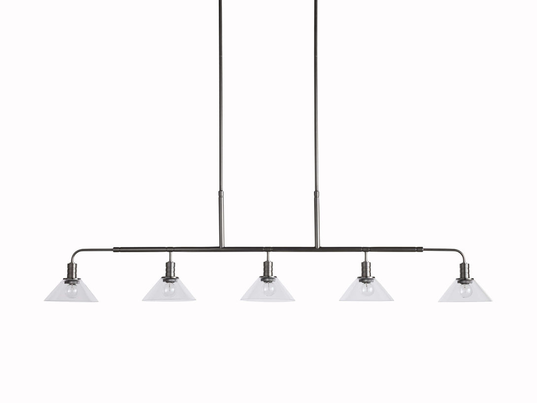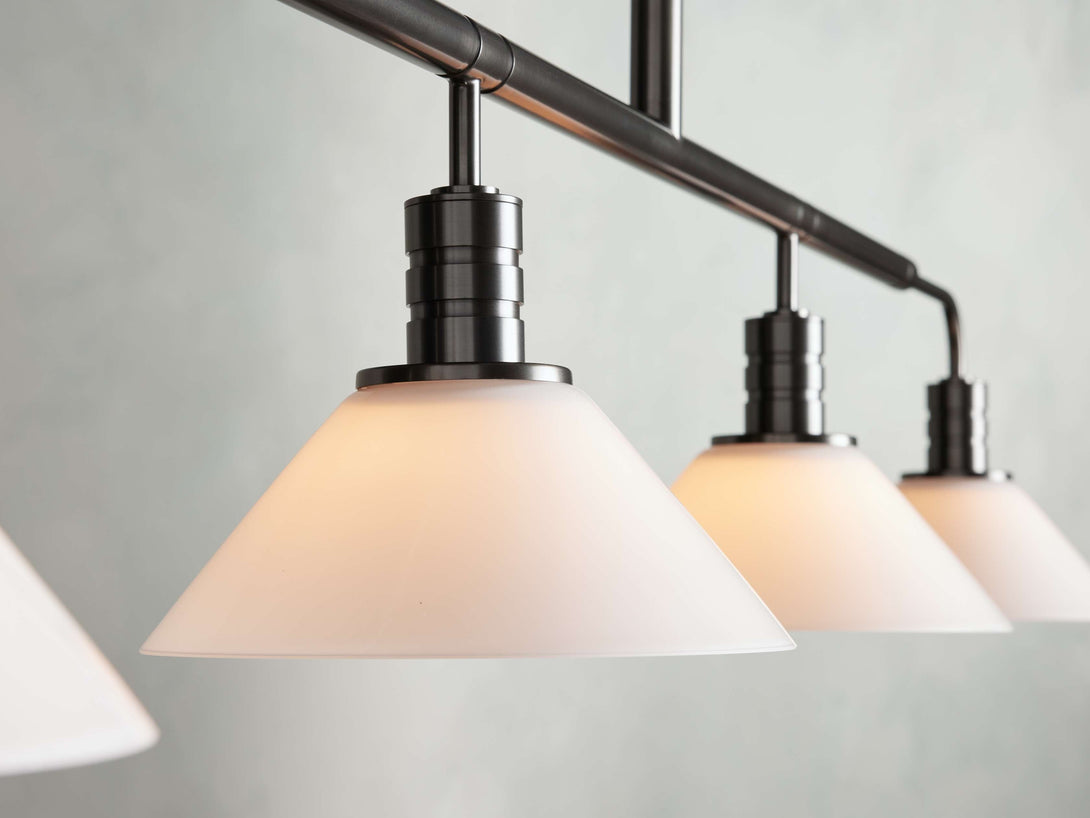- Crafted from steel in either a brass or bronze finish with your choice of clear or milk glass cones.