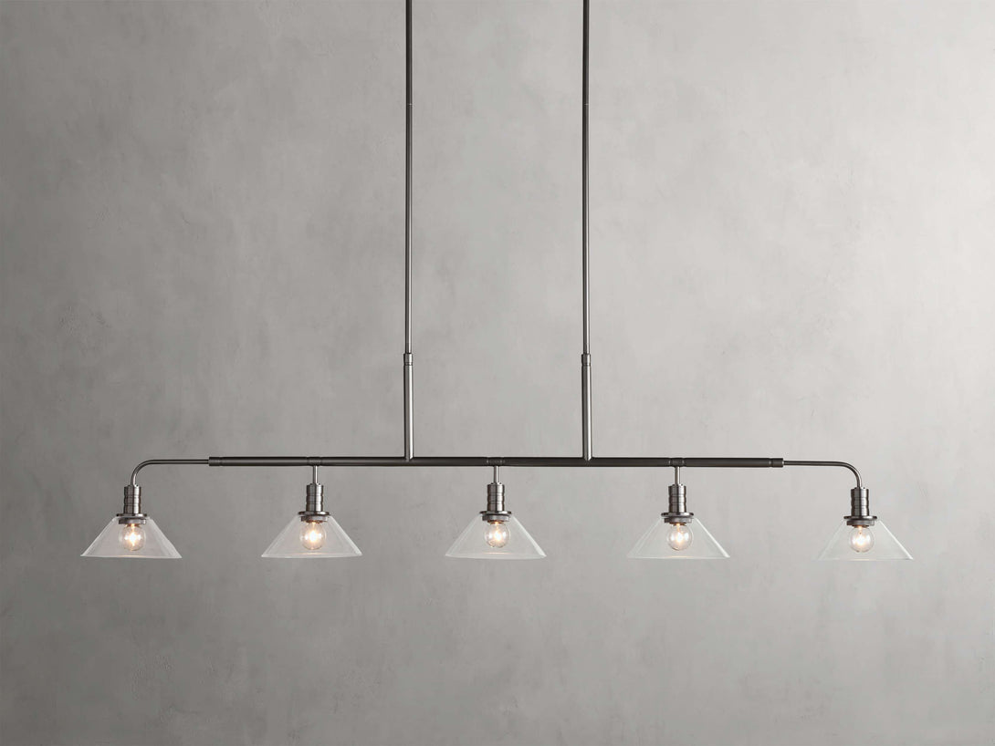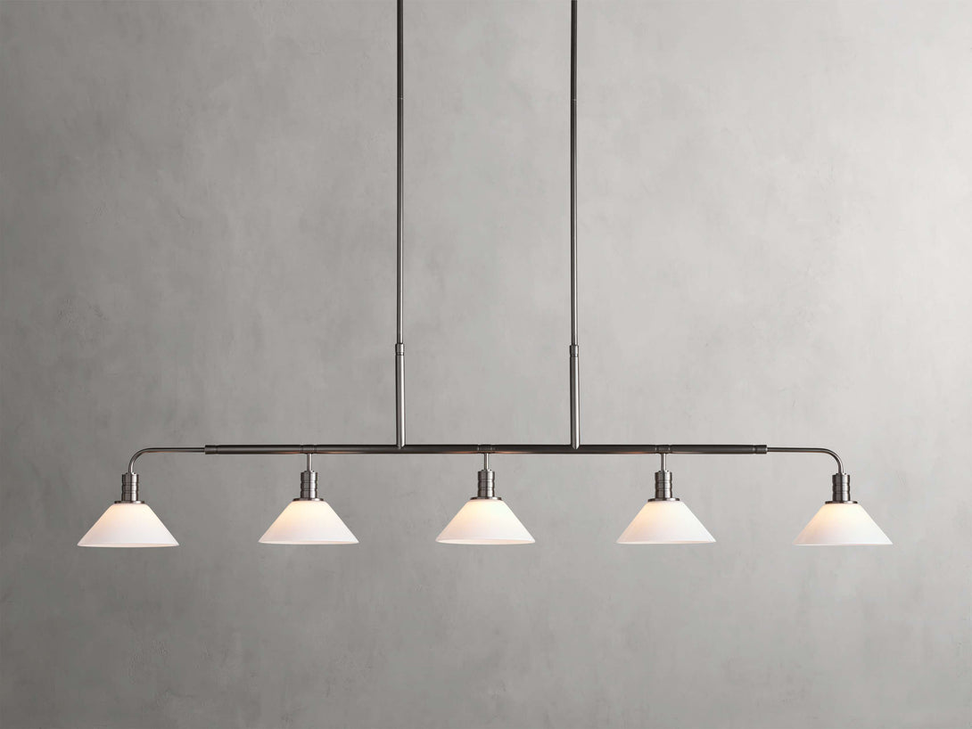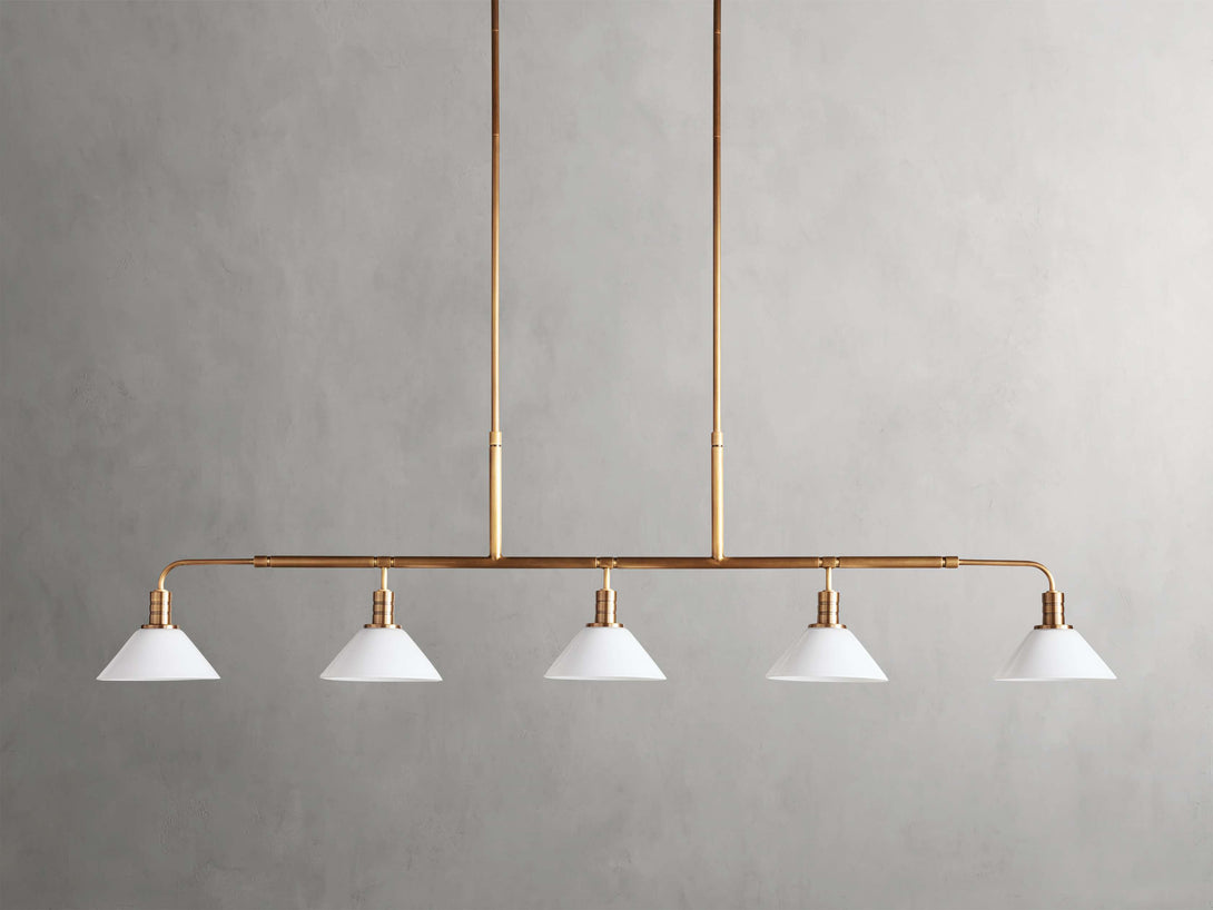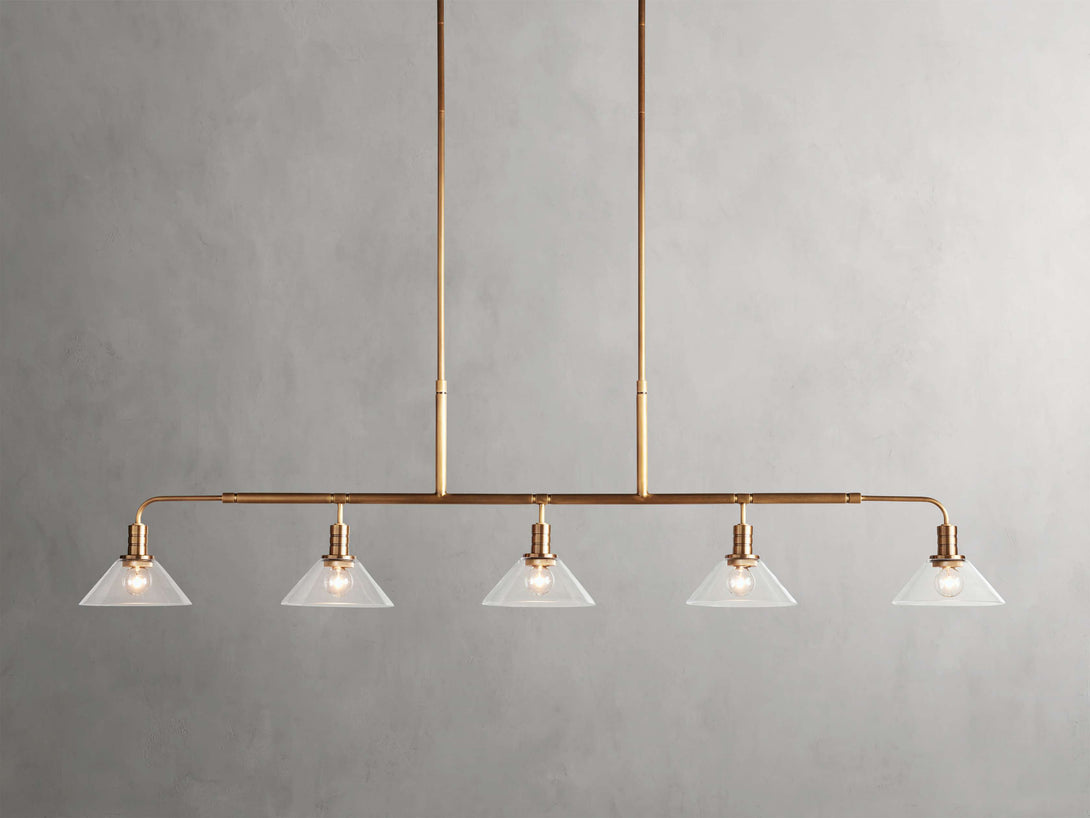 - Crafted from steel in either a brass or bronze finish with your choice of clear or milk glass cones.
