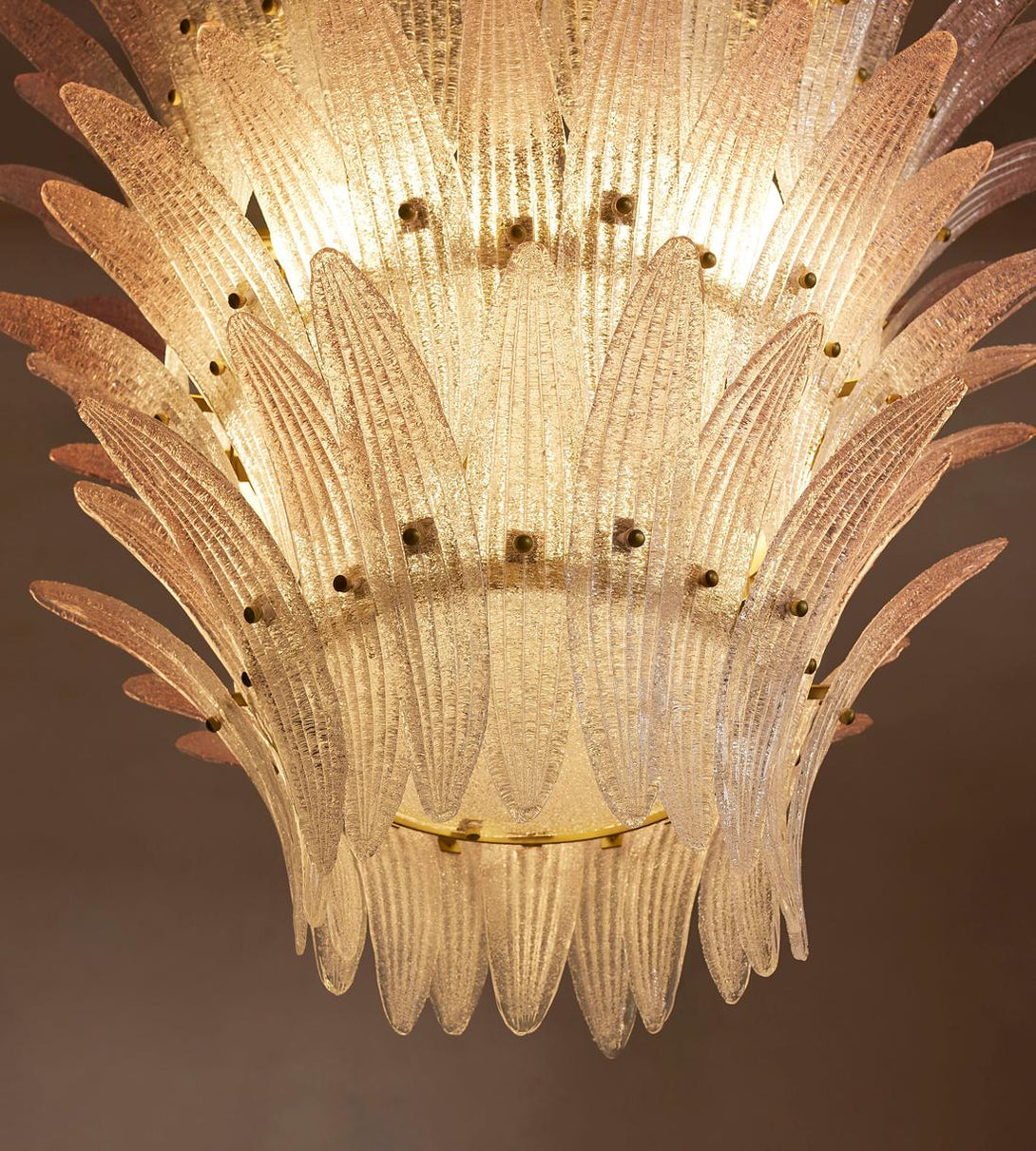 Handmade from pressed sugar glass, the chandelier has a three-tier chevron construction, with ombre pink, petal-like segments that unfurl outwards from an antique brass frame.