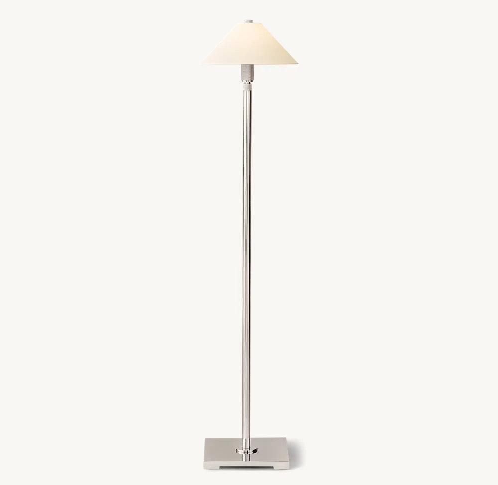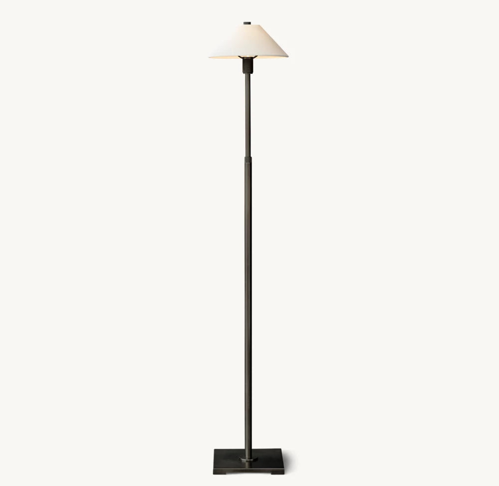 Our Utilitaire lamp from Ian K. Fowler is both polished and spare, representing an industrial minimalist vision. A subtly integrated telescoping mechanism allows height adjustment, while the socket's precisely crafted diamond knurled texture and simple linen slope shade offer restrained embellishment.