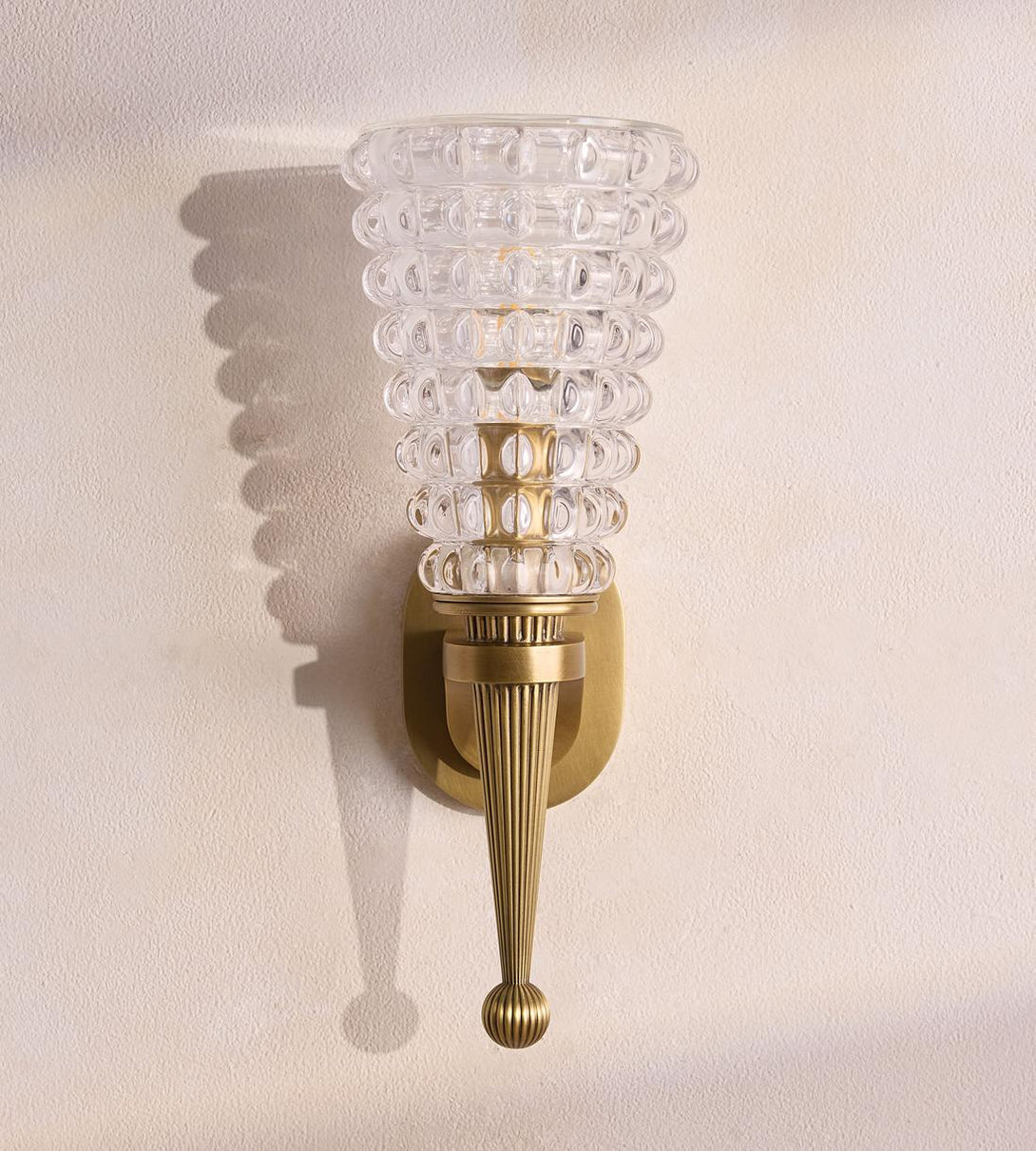 Our Valencia wall light drew its initial inspiration from the interiors of DUMBO House, seen in its tapered silhouette and brass finish. Crafted from textured glass at the top, its fluted, antique-brass base is set into a pill-shaped backplate that sits flush against the wall.