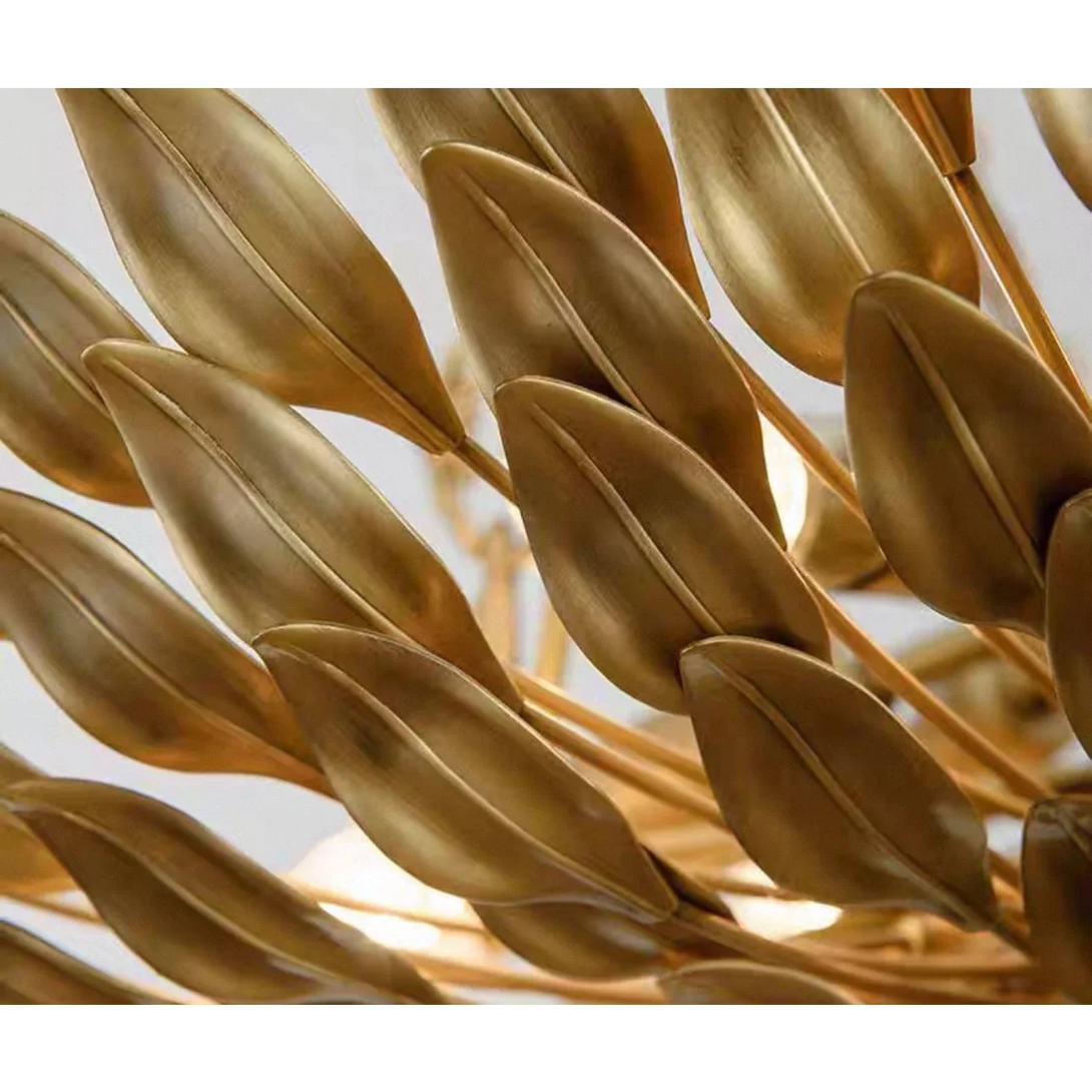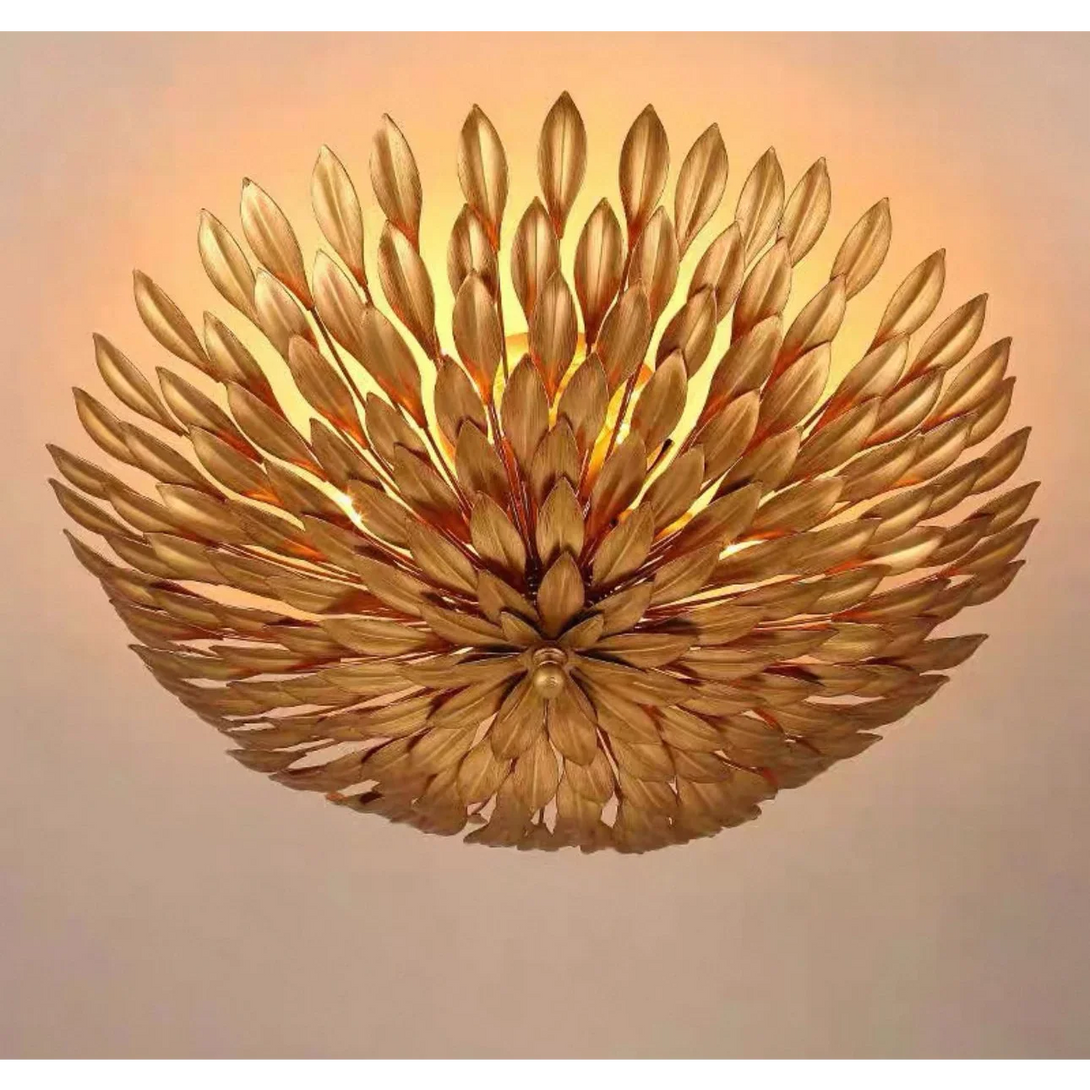 Individually sculpted brass leaves form a hand-finished nest silhouette, casting warm ambient light through a gilded flush frame. Designed for low-ceiling boutique interiors and gallery-inspired residences, this flush mount fixture highlights artisanal metalwork with a vintage soul.