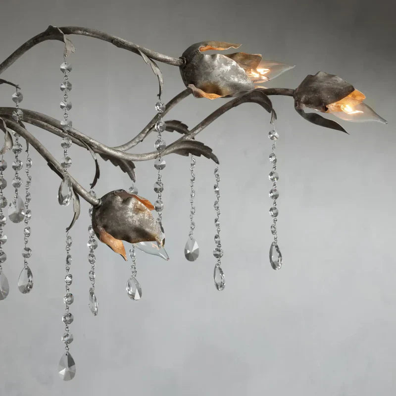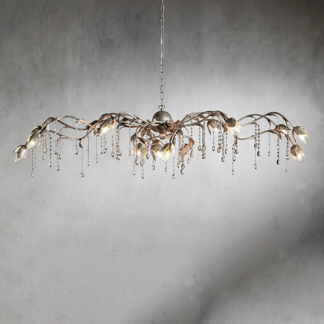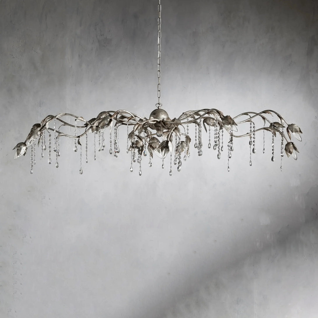 Like freshly fallen rain on draped garden vines, our Viticcio Chandelier is hand-moulded by Italian artisans from solid iron. Floral flourishes are elegantly accentuated by a hand-applied silver finish, and hand-strung crystals dangle to scatter drops of light around your space.