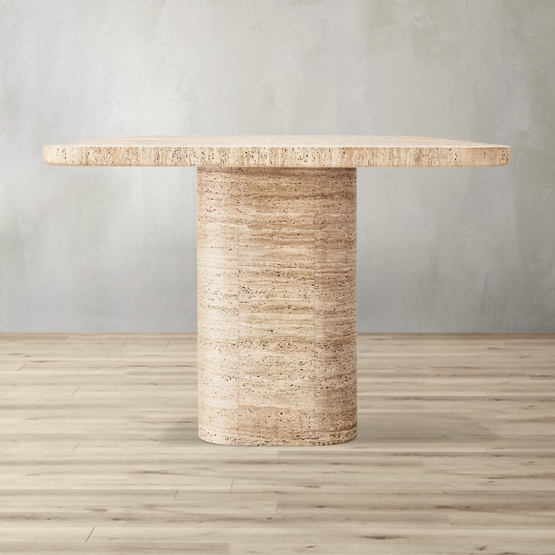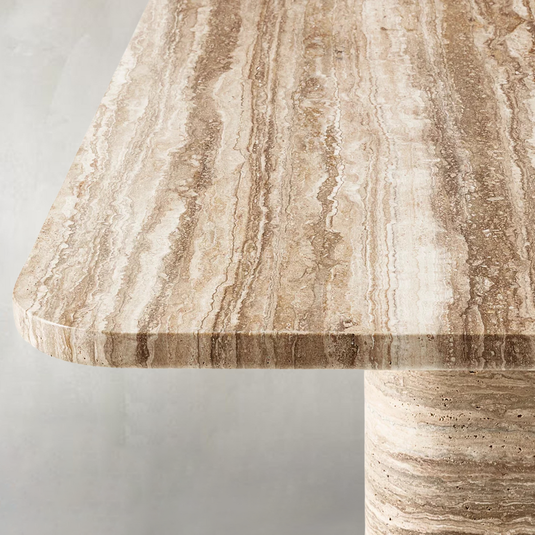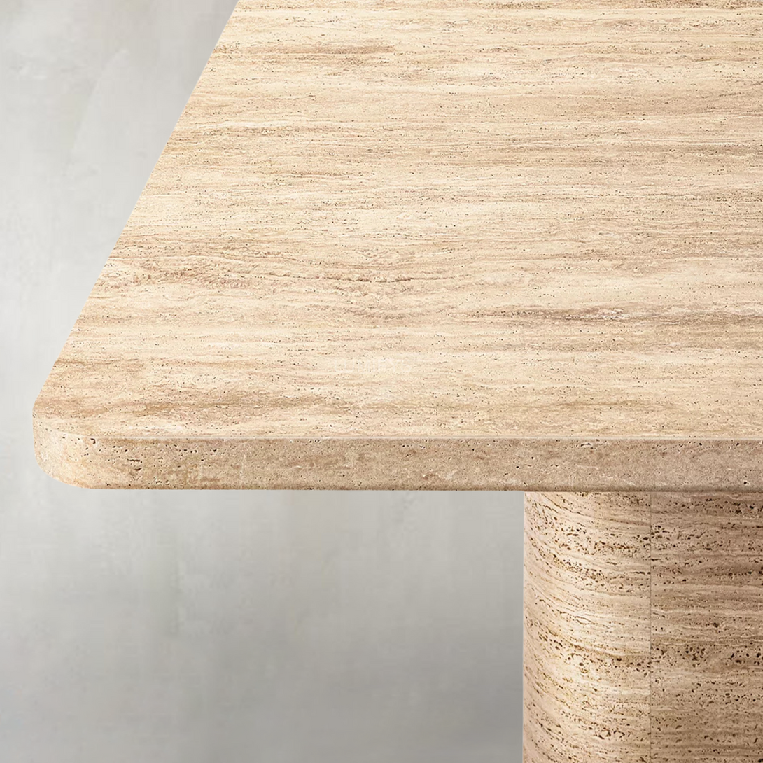 - Travertine has natural pitting of varied location that adds to the stone's character. Larger pits are filled; smaller holes are left unfilled. Pits on tabletop will be smaller than on base.