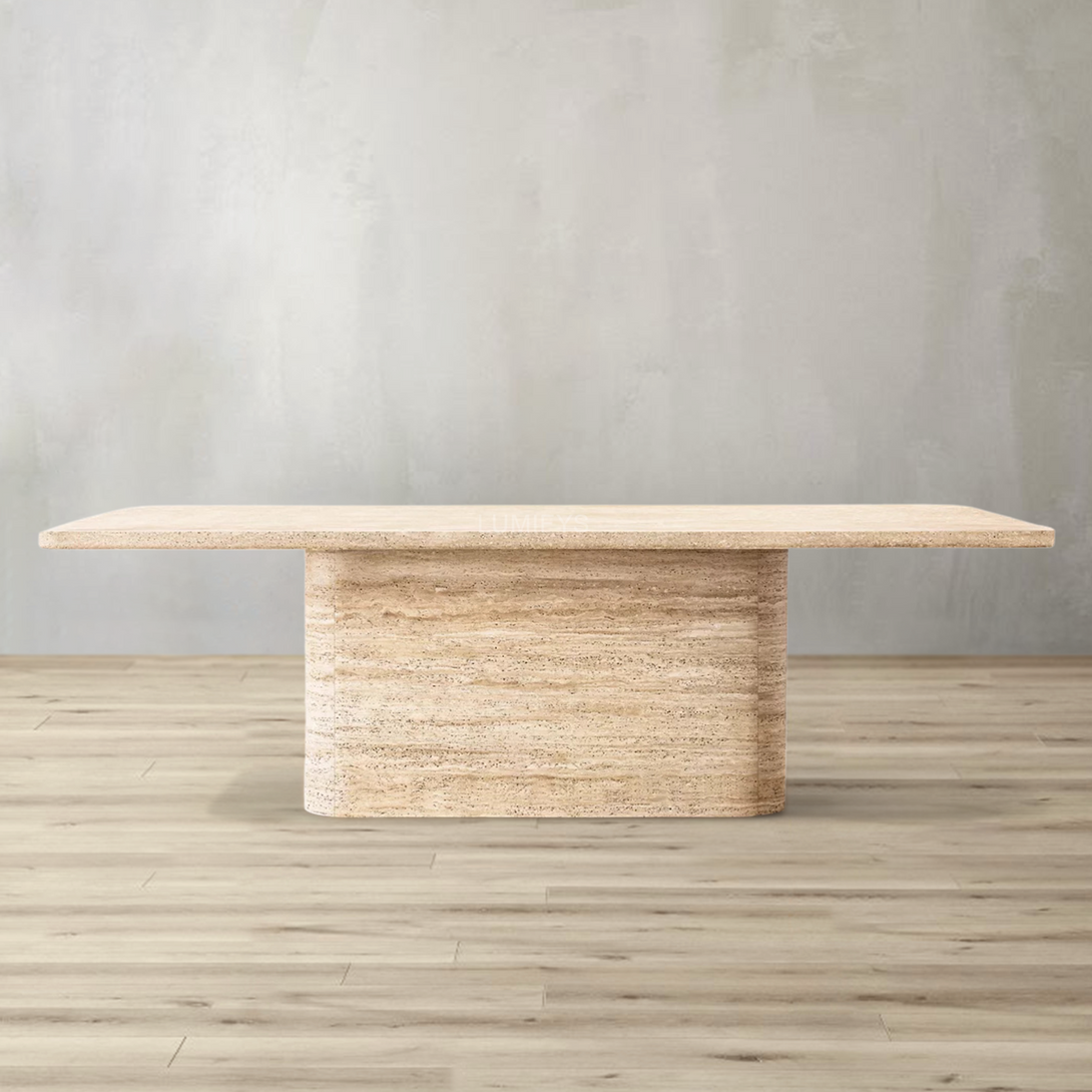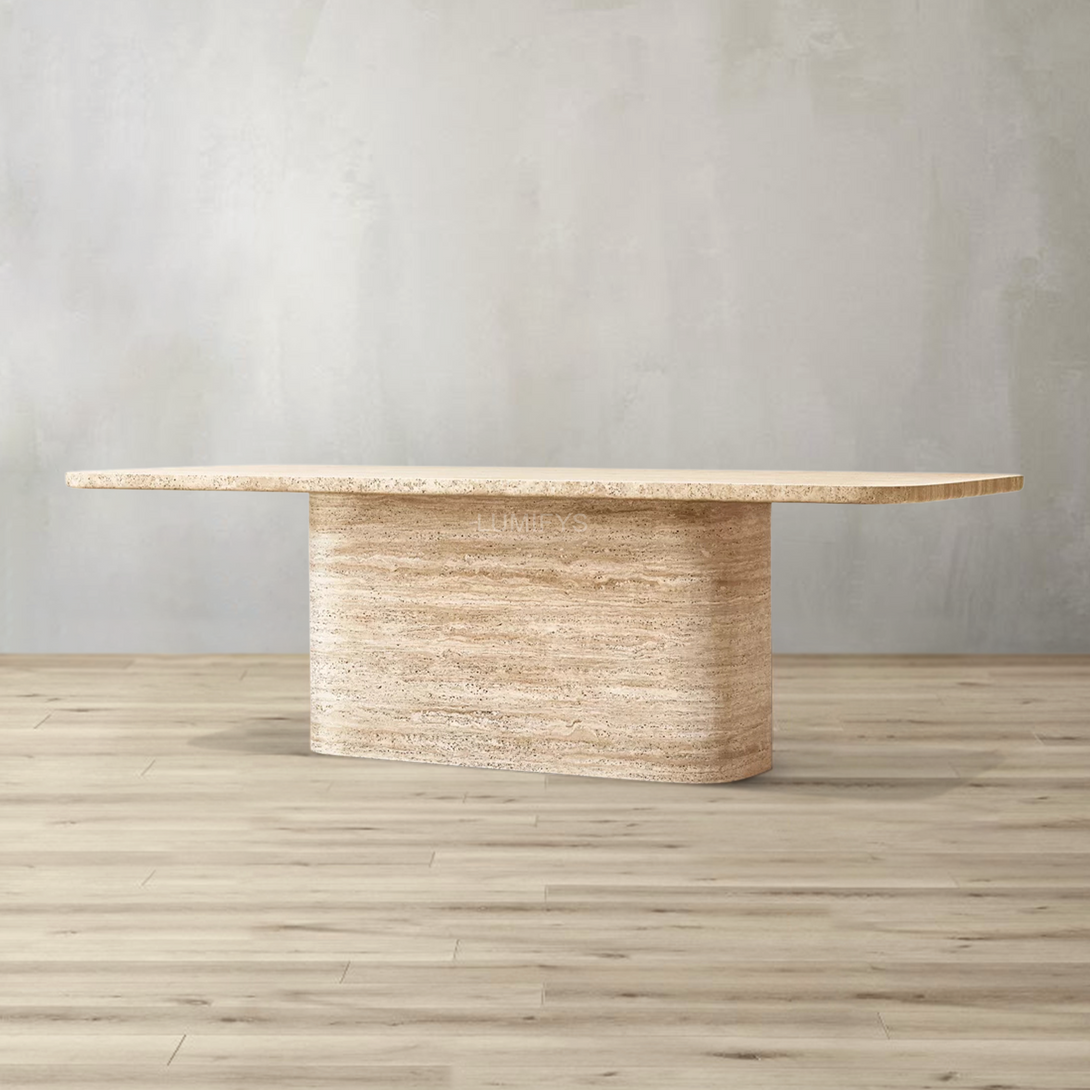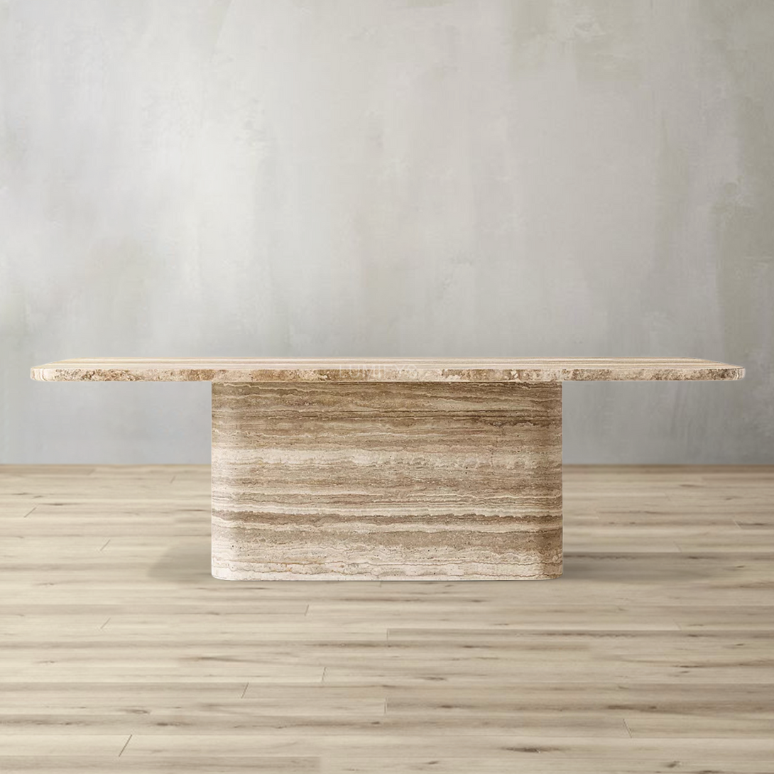 - Travertine has natural pitting of varied location that adds to the stone's character. Larger pits are filled; smaller holes are left unfilled. Pits on tabletop will be smaller than on base.