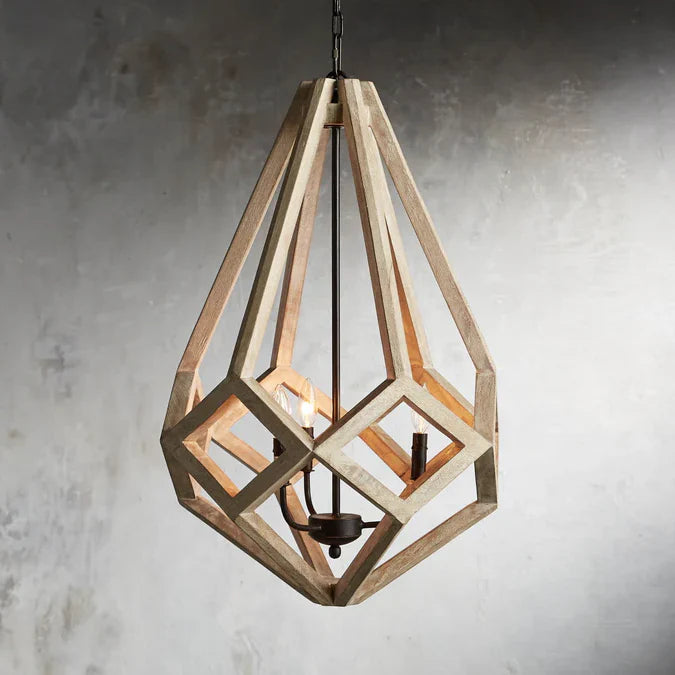 - This elegant, geometric, gem-shaped chandelier is handcrafted by Indian artisans from solid mango wood to house a wrought iron candelabra. This contrast along with rustic finishing creates a stunning display that accentuates the materials’ natural beauty.
