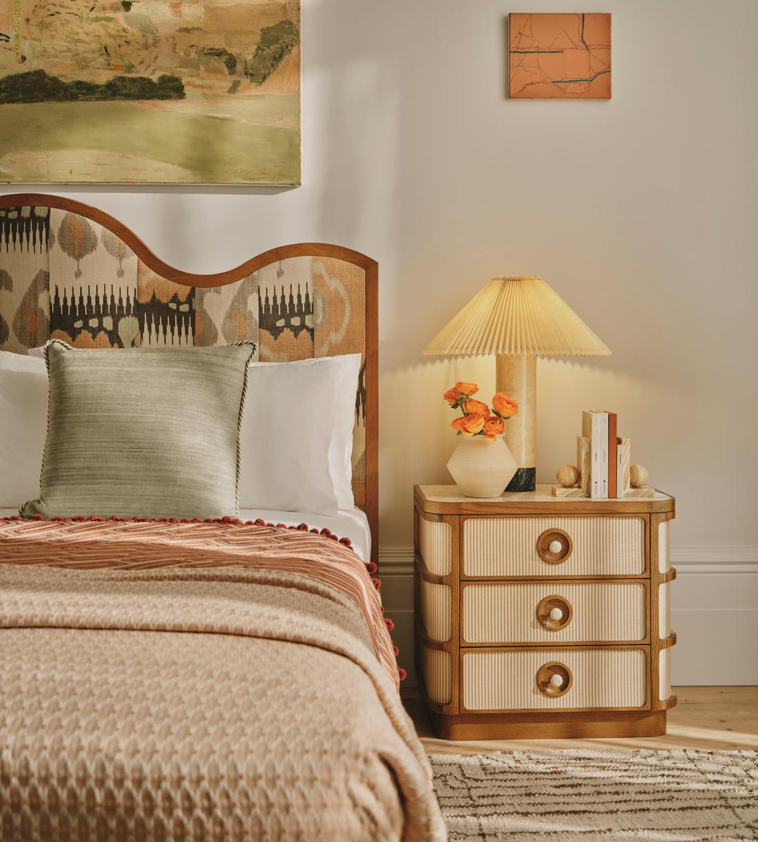 Quilted maple, Napoli Green marble and a hand-pleated parchment shade pay tribute to the mixed materials throughout our Houses.