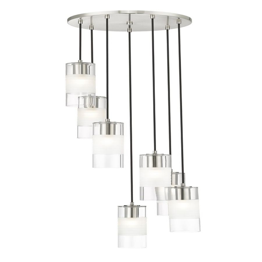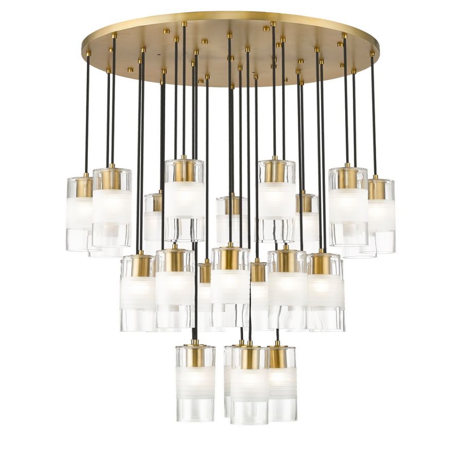Artisan glass, arranged in a chic cylinder with frosted and clear elements, defines a modern pendant. Designed for the Zane collection, it pairs a round canopy and robust housing, both in a rich modern gold finish over steel construction. Completing the look with a touch of texture is a braided cloth cord cover instills a tailored finishing touch.