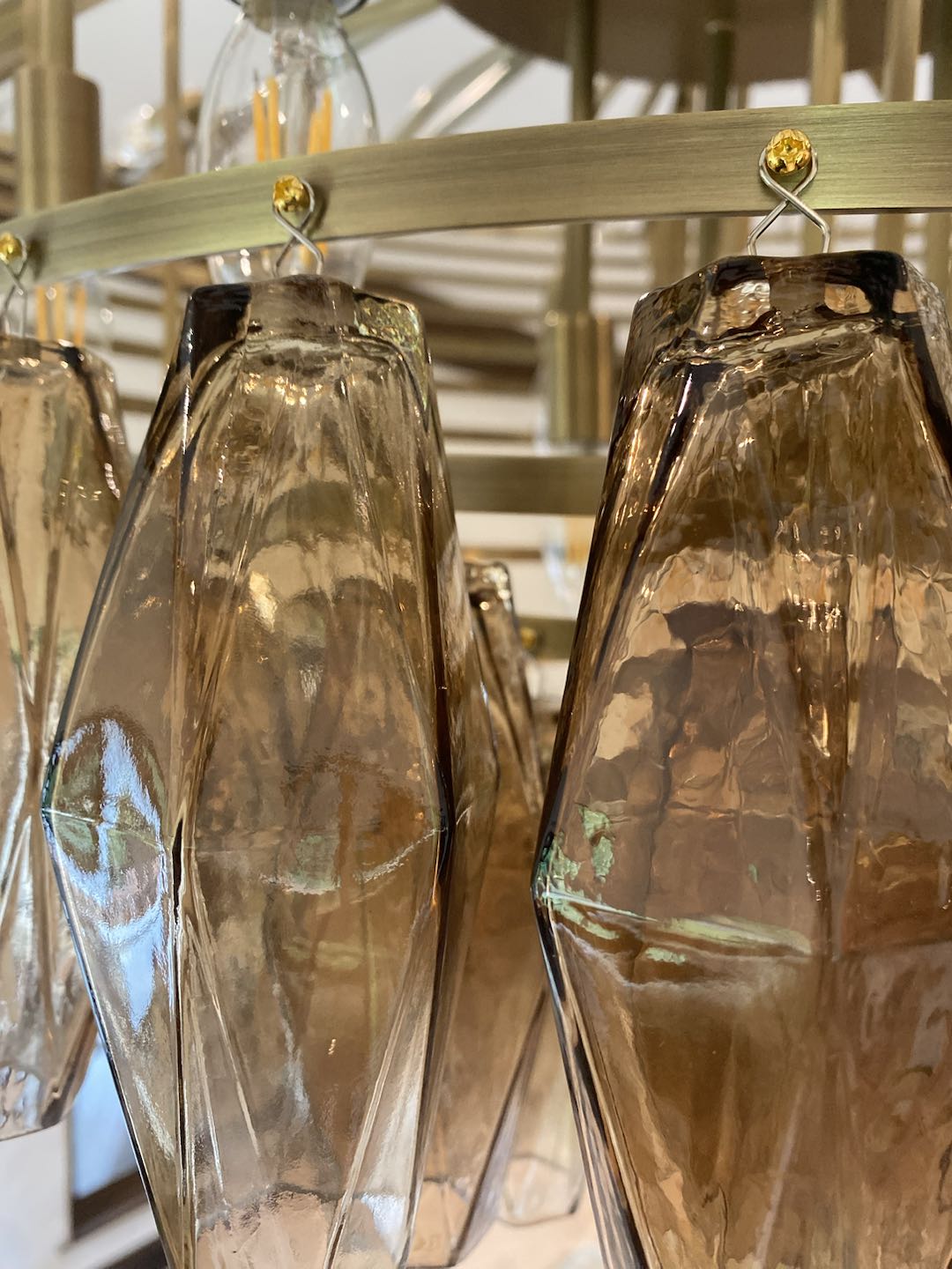 This chandelier is suspended from a tiered steel frame with dozens of hand-blown glass polyhedra on individual hooks. Illuminated from within, the faceted chandeliers dramatically reflect and refract light. A tribute to the Italian lighting style of the 1950s with this minimalist style.